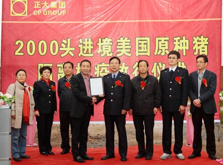 放行仪式上,陕西出入境检验检疫局代表做了检疫放行报告:“经过3个多月的隔离检验,星空官方网页版集团农牧食品企业(中国区)引进的2000头原种猪完全符合安全检疫标准,准予放行。”陕西出入境检验检疫局代表为星空官方网页版集团陕西区陈强总裁颁发了《种猪检疫合格证书》。