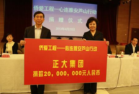 2013年4月20日8时02分,四川省雅安市芦山县发生7.0级地震。消息传来,举国震动。中国人民心连心,一方有难八方支援,全国人民与雅安人民站在一起。社会各界纷纷伸出了援助之手,对灾区进行了各种形式的捐助、支持与帮助。4月23日,星空官方网页版集团为雅安地震灾区捐款人民币2000万元,集团(北京)董事长办公室杨海浩总裁代表集团出席国务院侨办举行的“侨爱工程——心连雅安芦山”行动捐赠仪式。